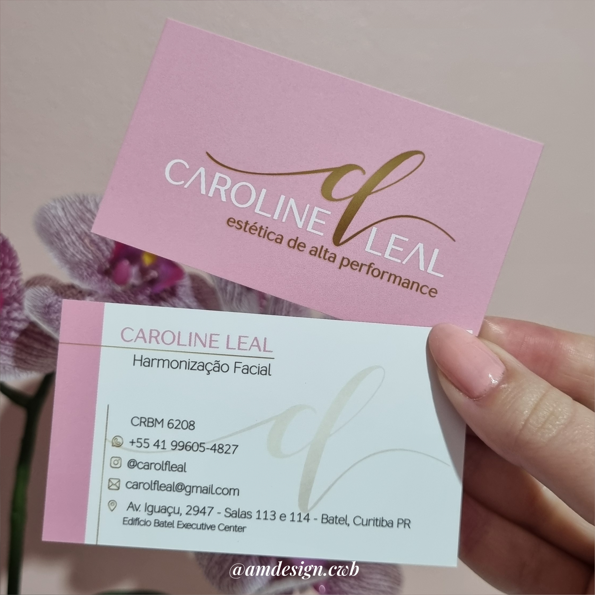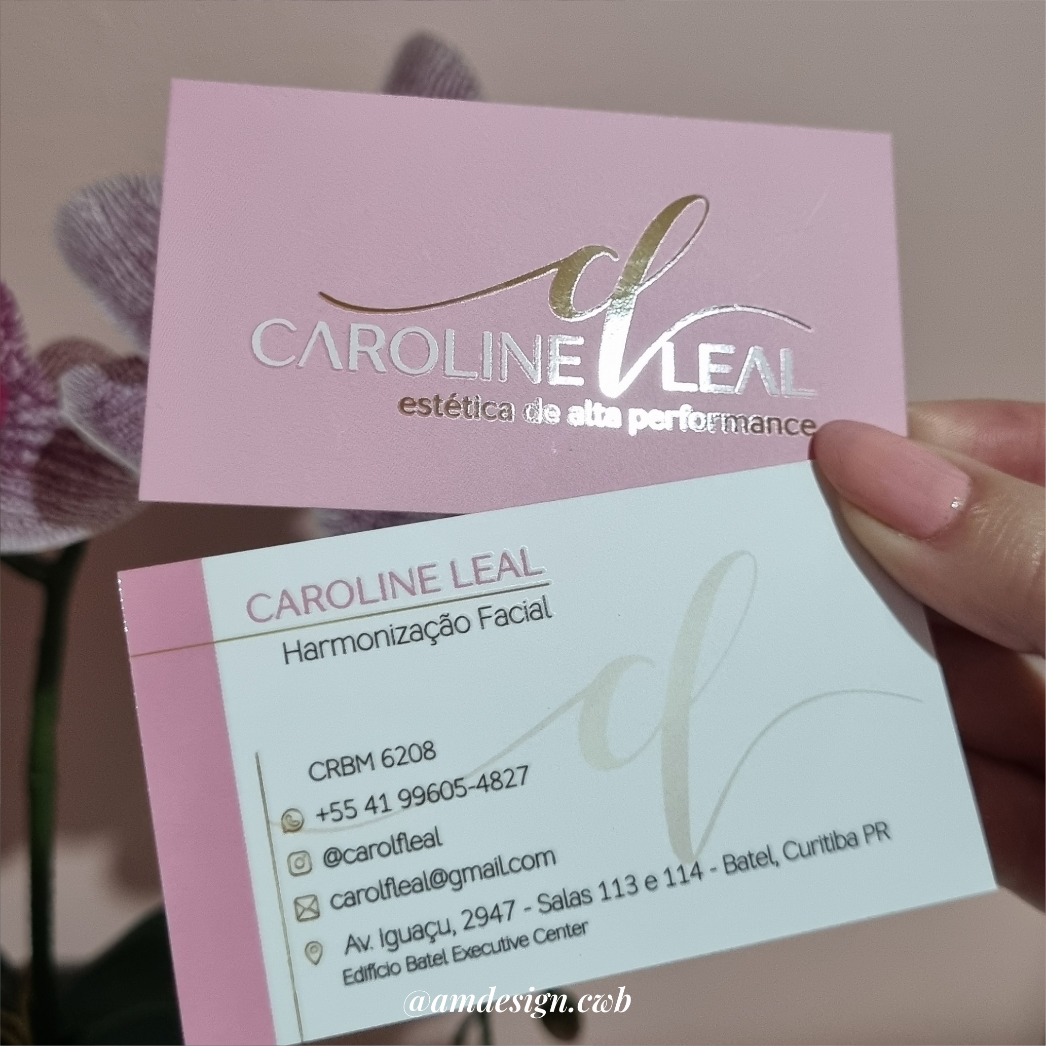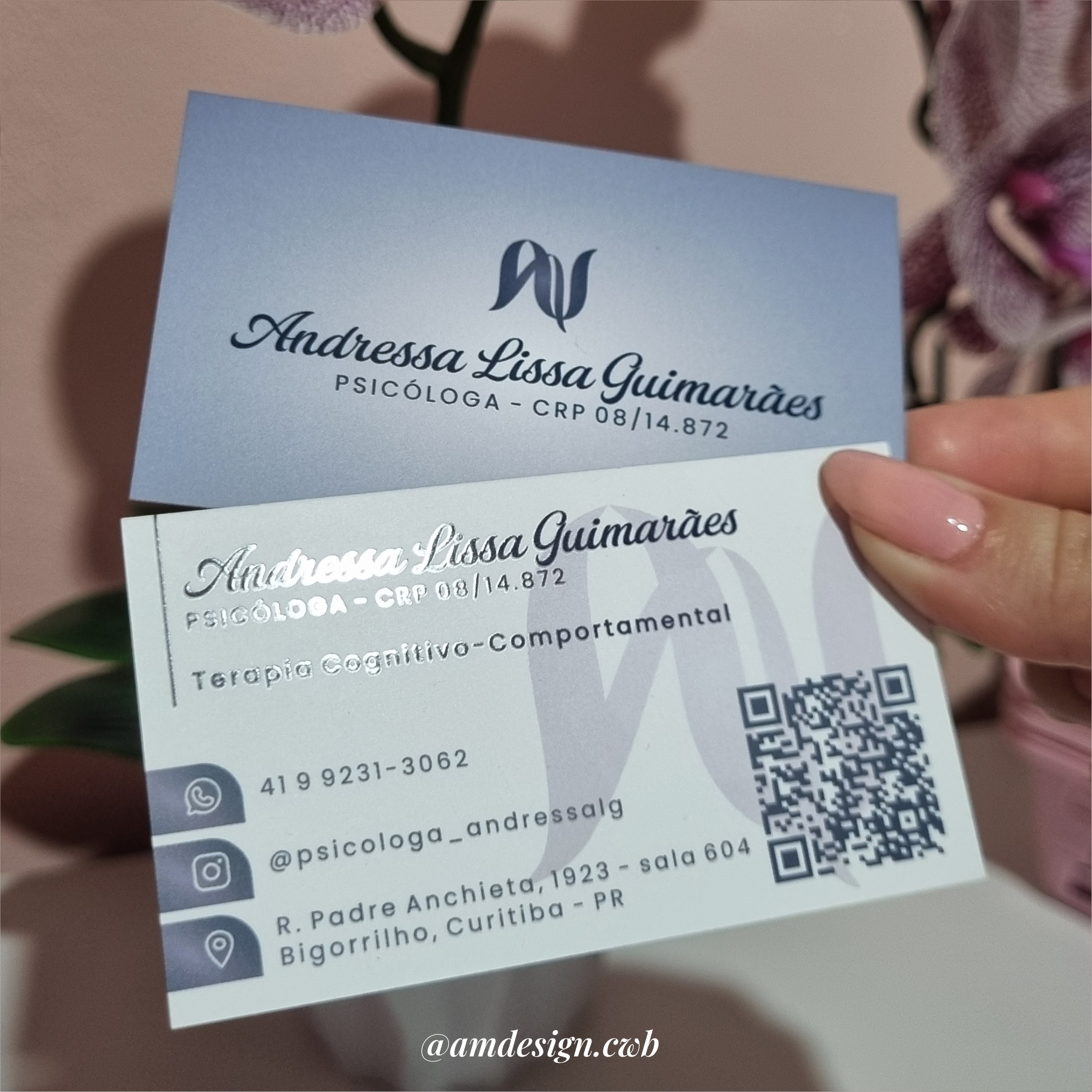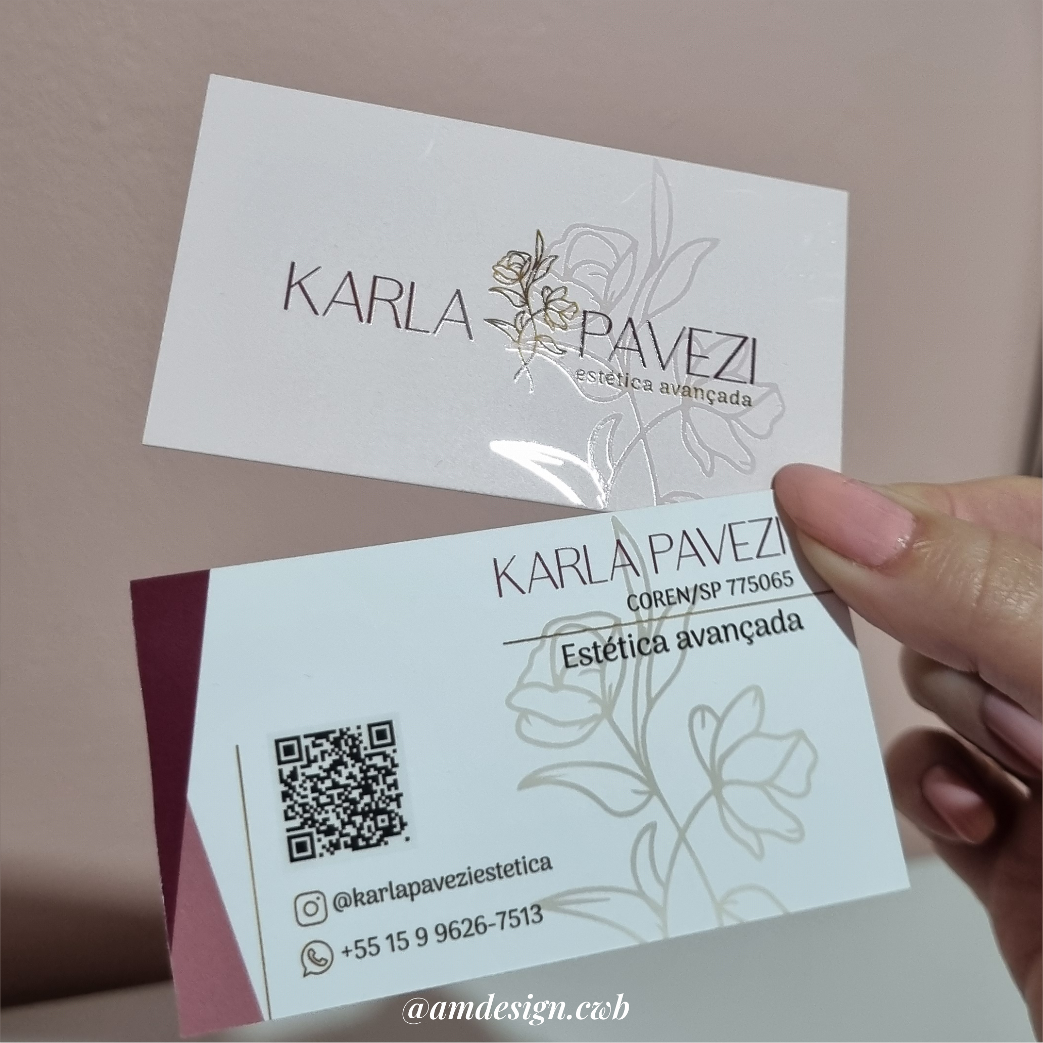 Cartão impresso em papel couchê 300g, com laminação fosca e verniz localizado na frente e no verso.